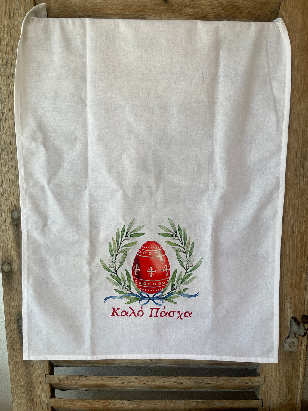 Elevate your Greek Easter celebrations with this beautiful white cotton tea towel, adorned with a vibrant wreath and a striking red Easter egg. Celebrate Καλό Πάσχα (Happy Easter in Greek) with this charming piece! Crafted from 100% cotton, it will infuse your home with lively color and festive cheer. It's also a delightful gift that’s sure to bring joy!