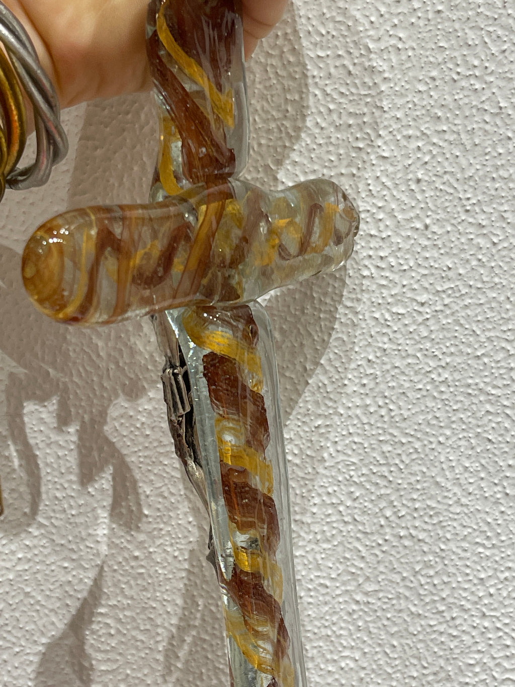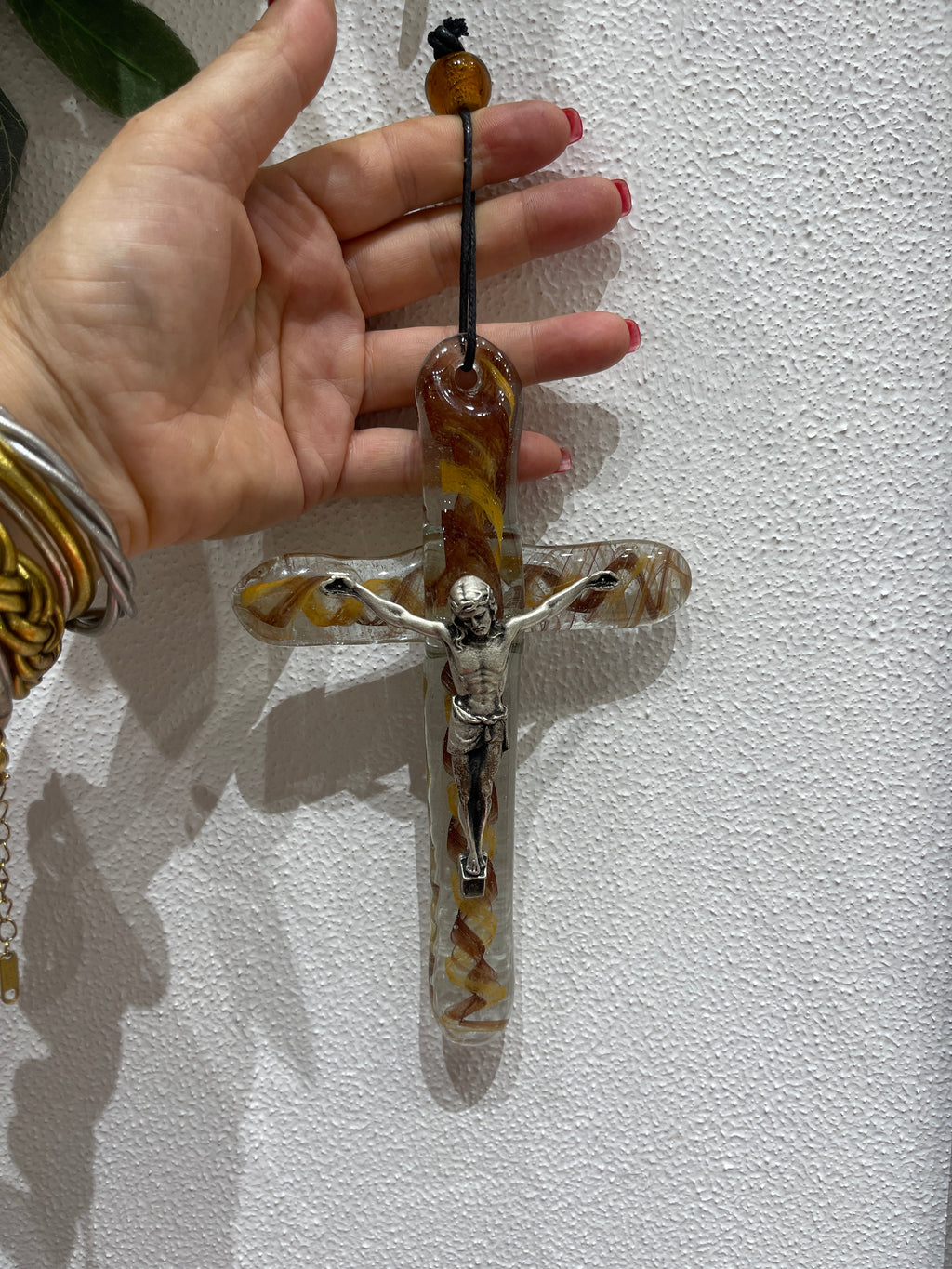 A beautiful hand made glass cross with amber and brown tones. Featuring Jesus Christ on the Cross. A very special religious piece. Hand made in Greece. Comes ready to hand. The glass is made entirely by hand. No two pieces are the same.