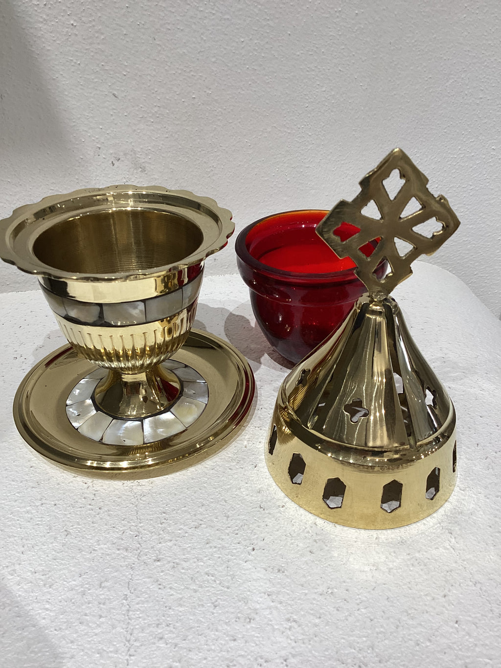 A beautiful brass and mother of pearl vigil oil lamp - Kandili. The Vigil lamp comes with a red glass vessel to hold the oil and water and light. The Kandili features a brass cross at the top and a removable lid. It can be displayed open or closed.
