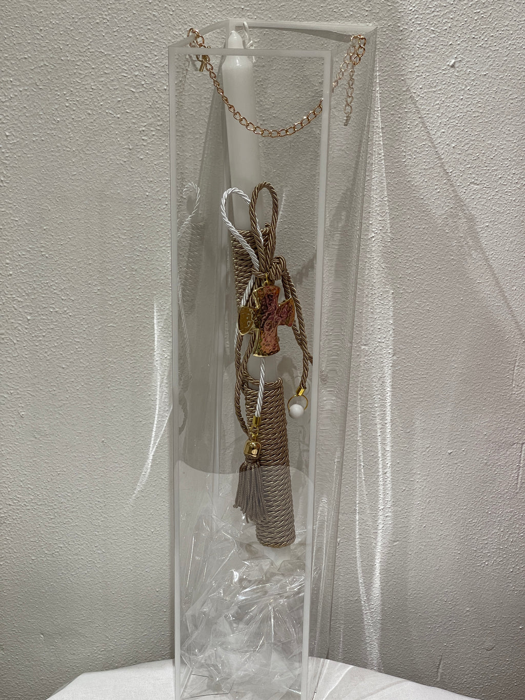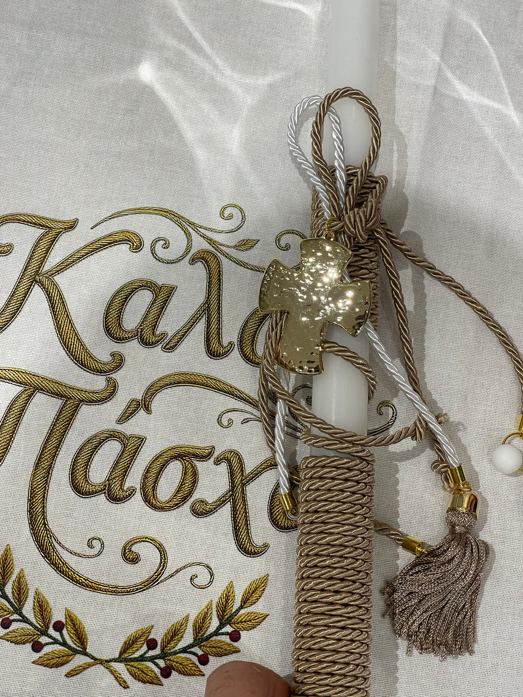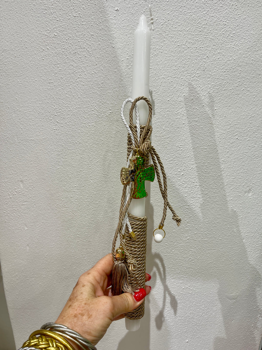 Beautifully crafted, hand made luxury Lamabatha (Easter candle)  with a large Gold Cross Latte coloured cord and tassel. Simple, elegant and suitable for male and female.