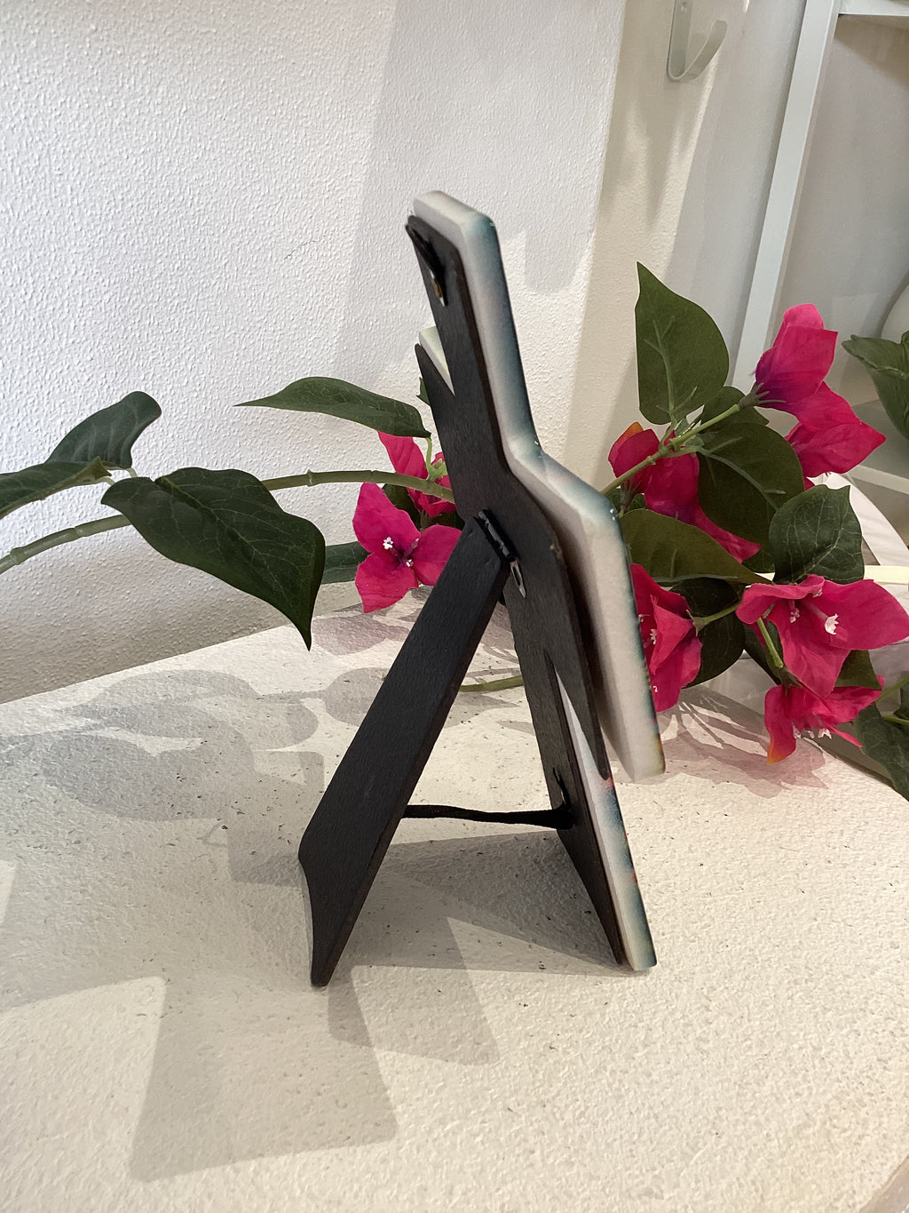 Ceramic cross featuring the Mother Mary. Freestanding with built in stand or hang with included hook.
