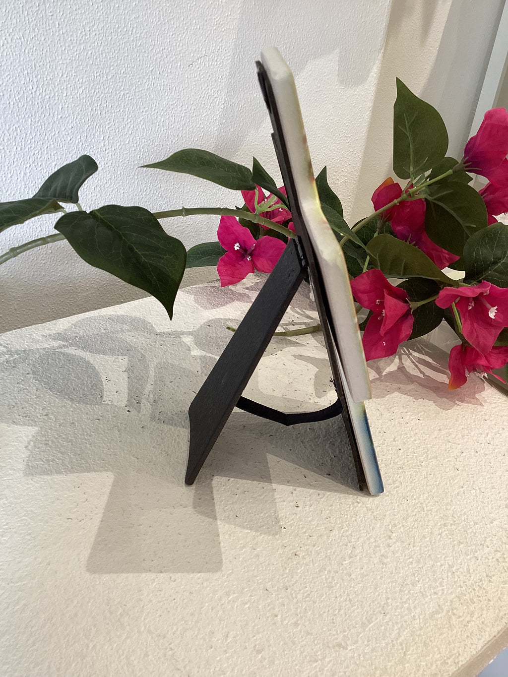 Ceramic cross featuring Mary, Joseph and Baby Jesus. Freestanding with built in stand or hang with included hook.