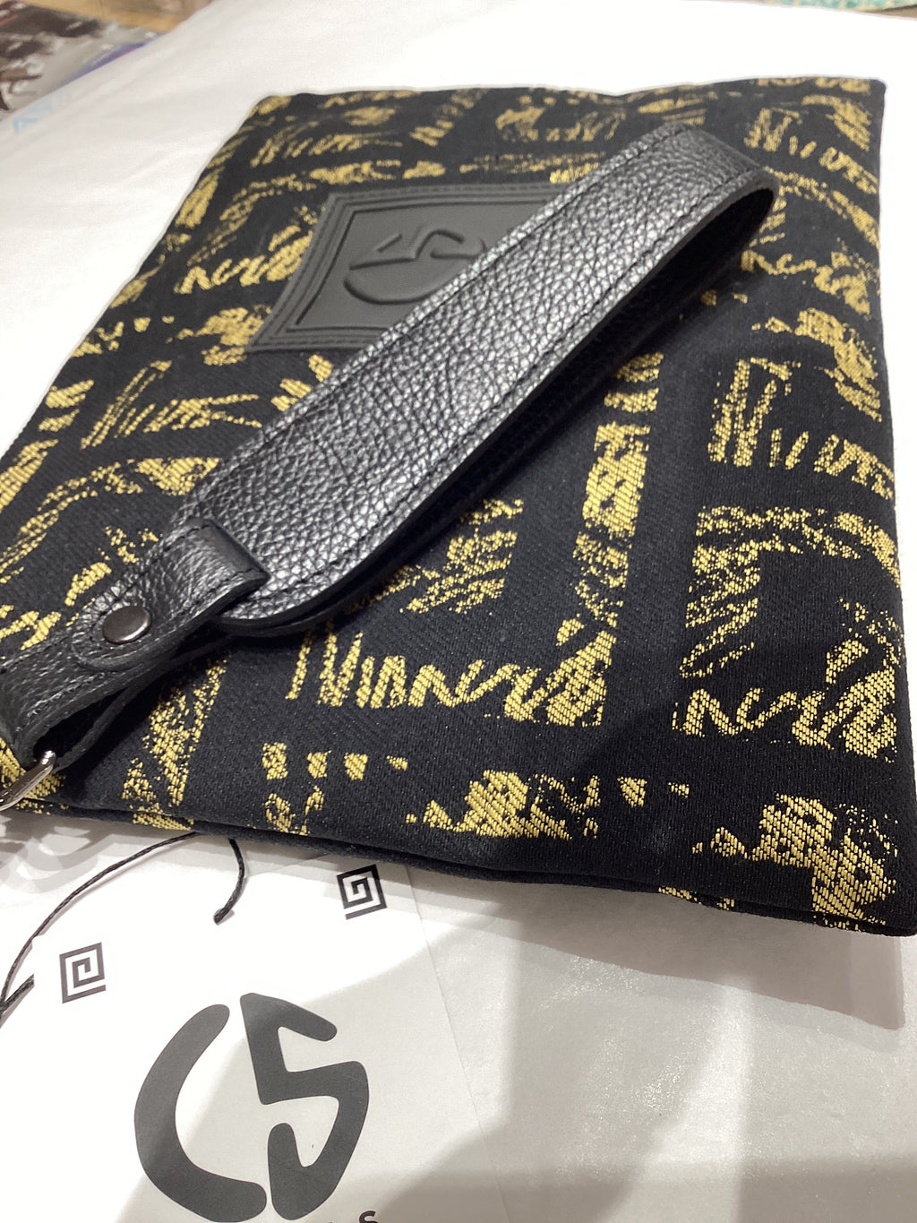Amelia #8 Greek Key cotton and Leather Clutch Black and Gold