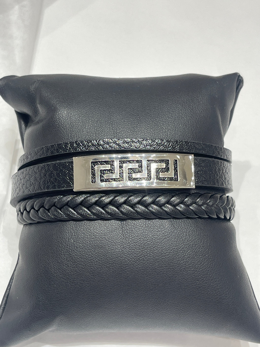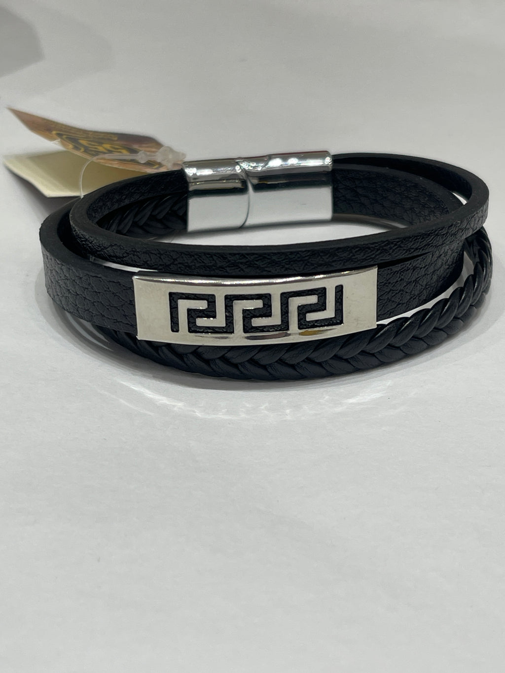 Stylish Black leather bracelet for men. Featuring three leather straps with a stainless steel Greek key design in the centre. Stainless steel secure clasp at the back. one size - fits medium size men’s wrists
