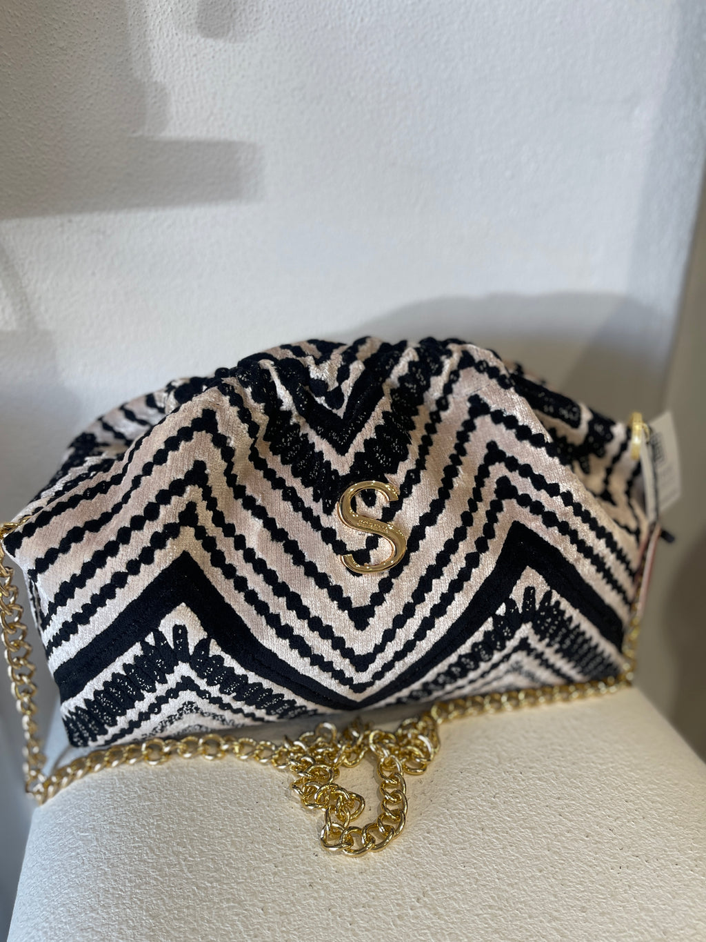 Make a statement with the Koufonisi large Bucket Bag from SORENA. Made in Greece from luxury black and cream woven fabric with snap closure, cotton lining inside and detachable gold chain. Comes with dust bag. A stunning bag for day or evening.