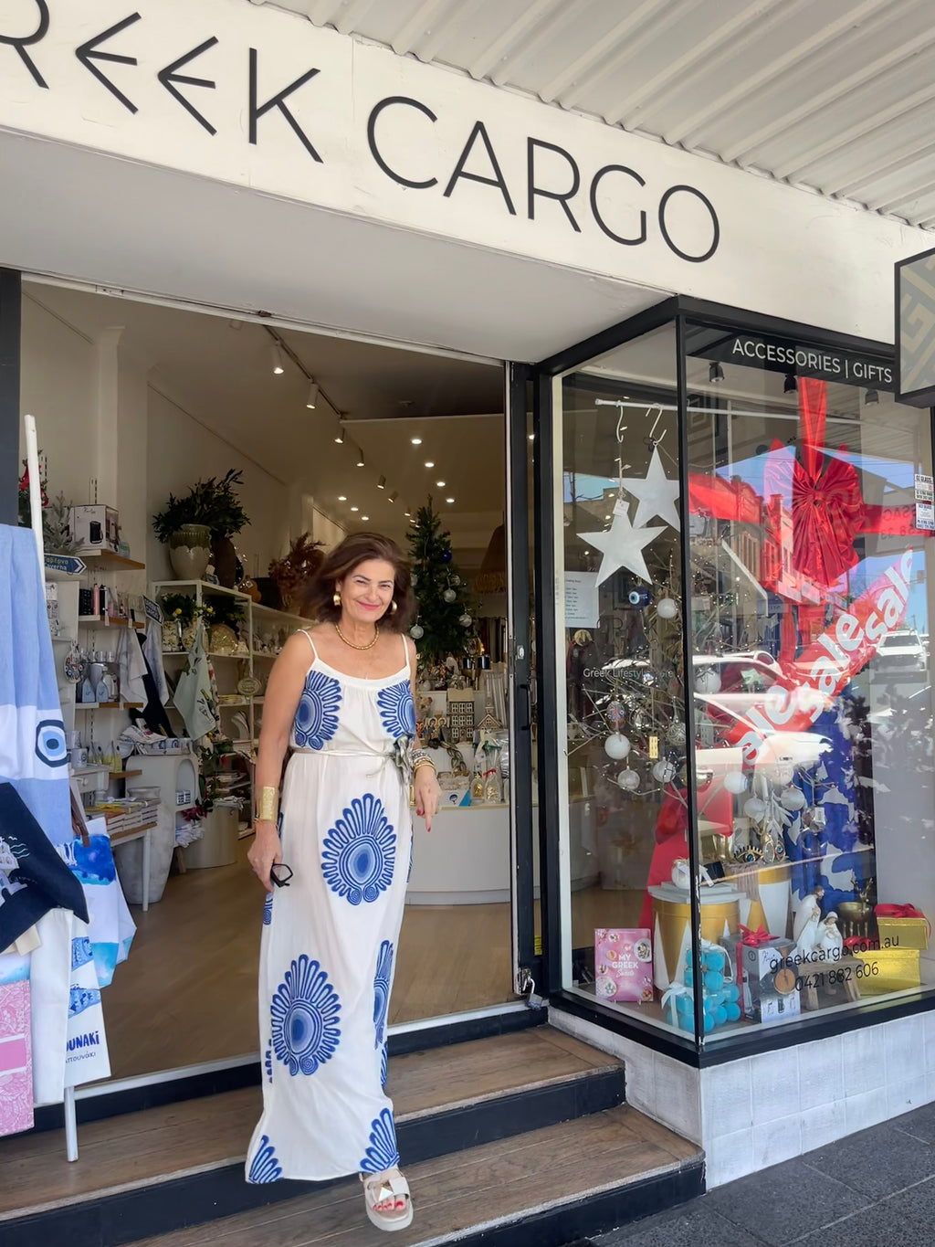 Breeze through summer in effortless style with our Greek Sun Maxi Dress, lovingly made in Greece. Crafted from soft, breathable cotton fabric, this flowing maxi features bold hand-inspired blue embroidery that captures the essence of the Aegean. Its relaxed silhouette, delicate adjustable straps, and timeless cream base make it perfect for warm days, coastal escapes, and everyday elegance.